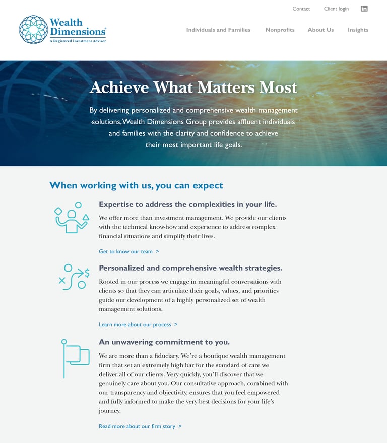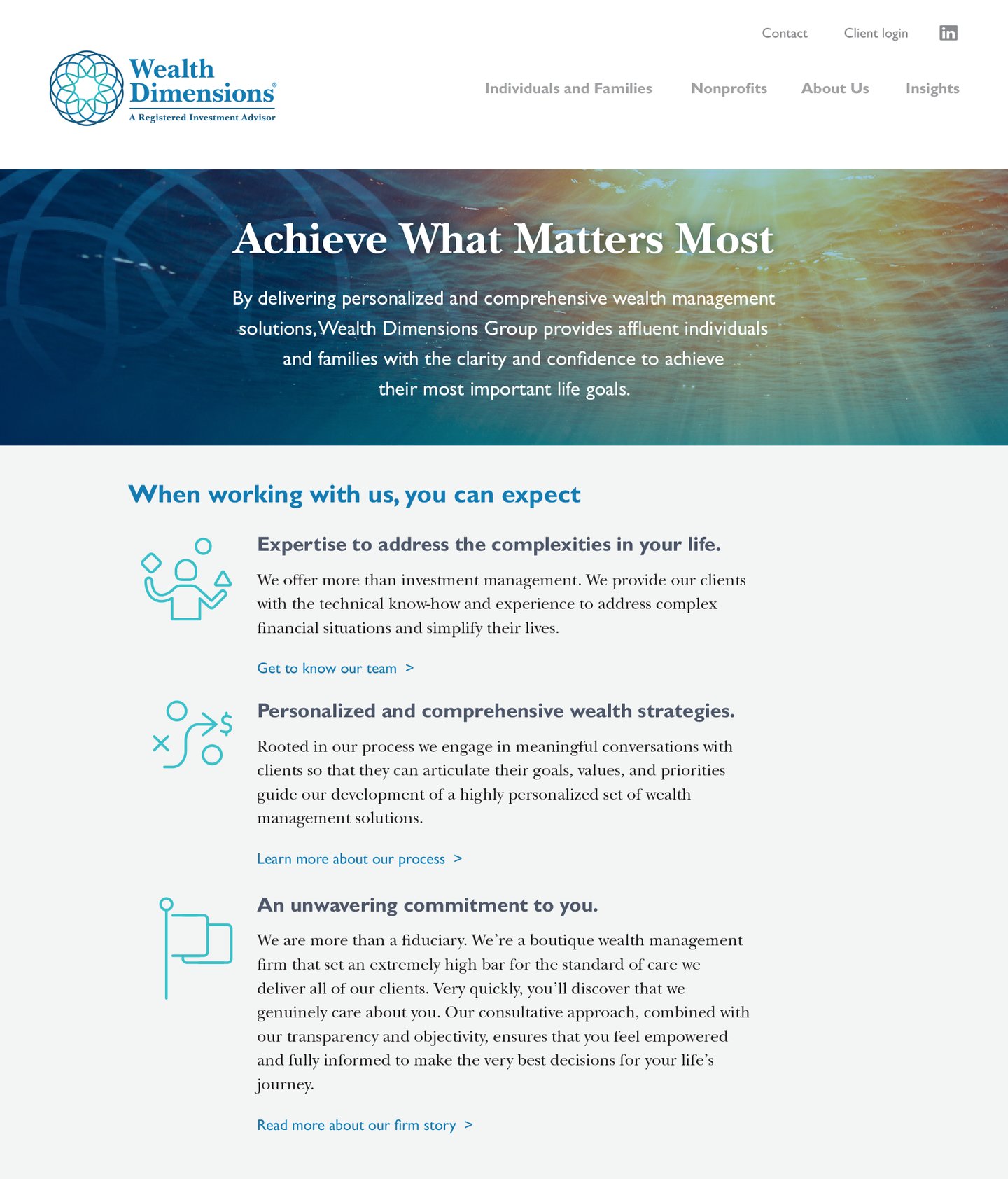 Wealth Dimensions is an investment firm located in Cincinnati. When creating their logo, I was inspired by shapes which suggested lenses, glass, and light. Additionally, I created the brand identity, brand guide, photo selects, and a system of iconography.